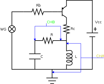 Put another way, because the CHA measurement is already referenced to ground the CHB measurement must be also but this is impossible because connecting the ground to either side of R will short-circuit either L or C breaking the tank circuit.